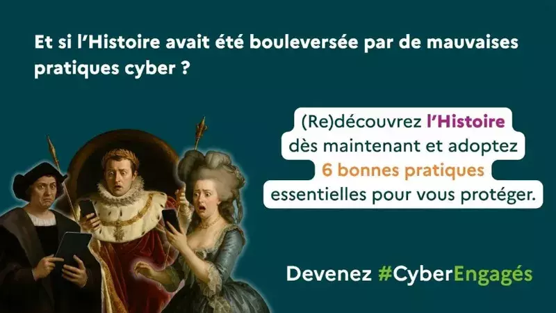 Pour porter ce cybermois, Cybermalveillance.gouv.fr a développé la campagne de communication « Histoire de Cyber » qui met en parallèle de façon originale des faits historiques avec des conseils sur l’usage des outils numériques :